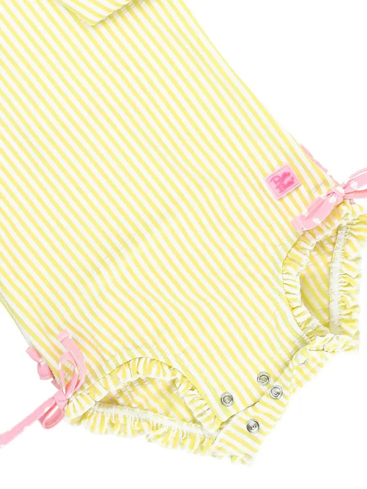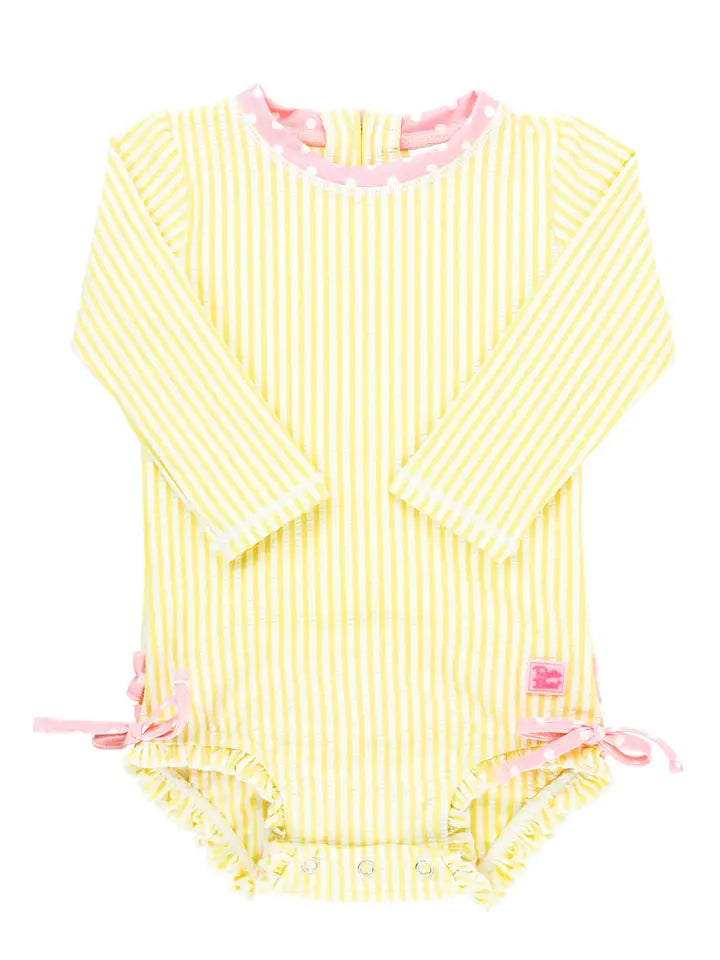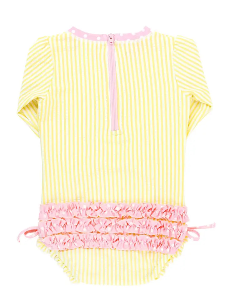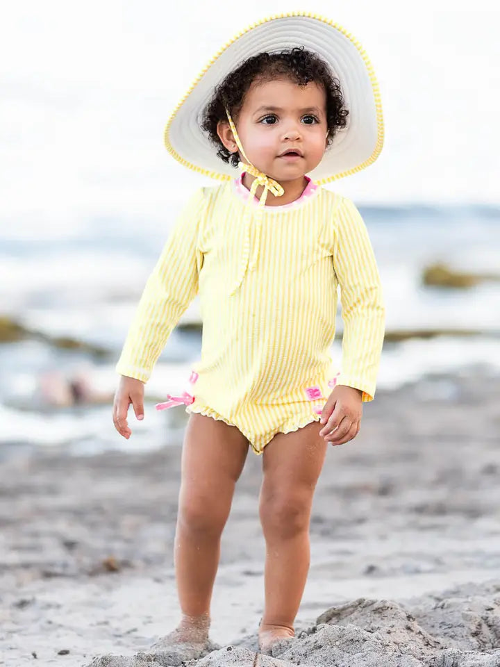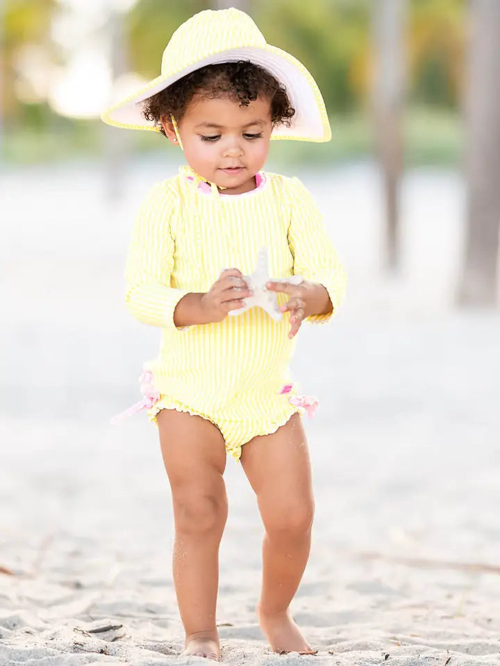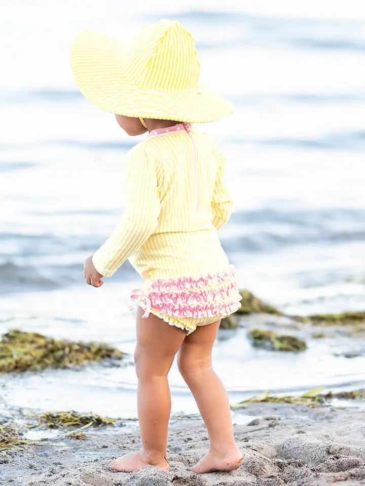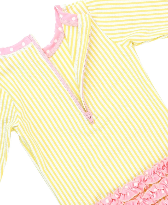 Made with a high quality UPF 50+ sun protected fabric, this unlined one piece seersucker bathing suit will keep safe in the sun all day long. Plus, the nickel-free snaps and back zipper make changing a breeze!