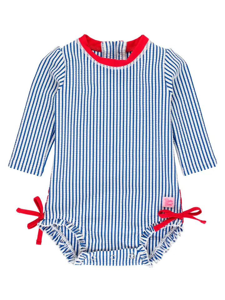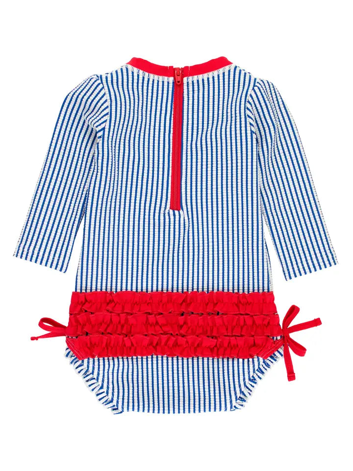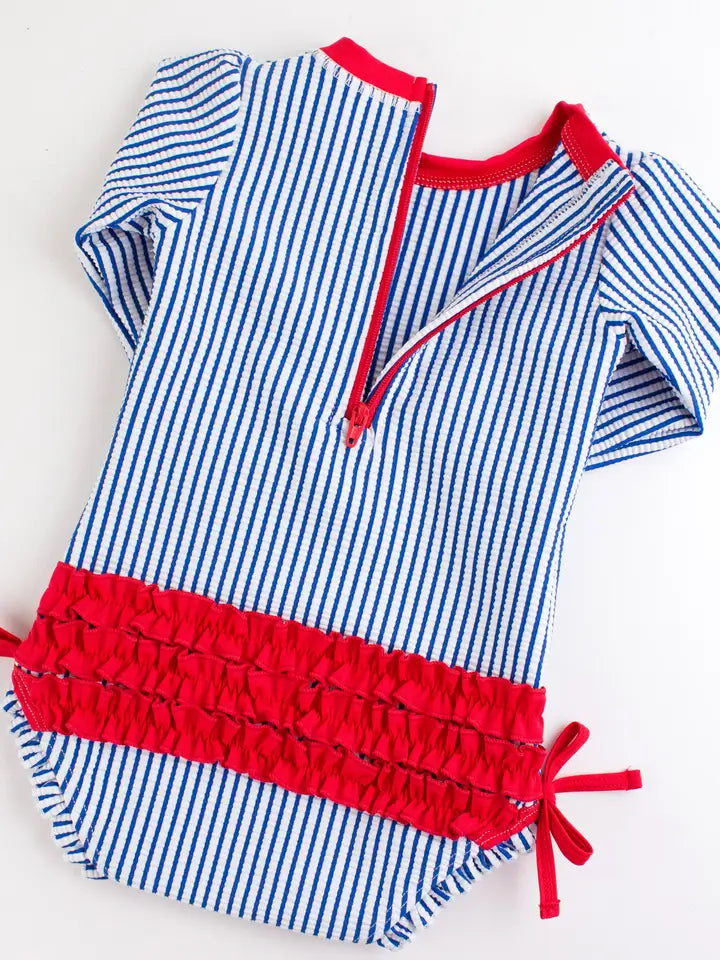 Made with a high quality UPF 50+ sun protected fabric, this unlined one piece seersucker bathing suit will keep safe in the sun all day long. Plus, the nickel-free snaps and back zipper make changing a breeze! Add her monogram for a personalized touch.