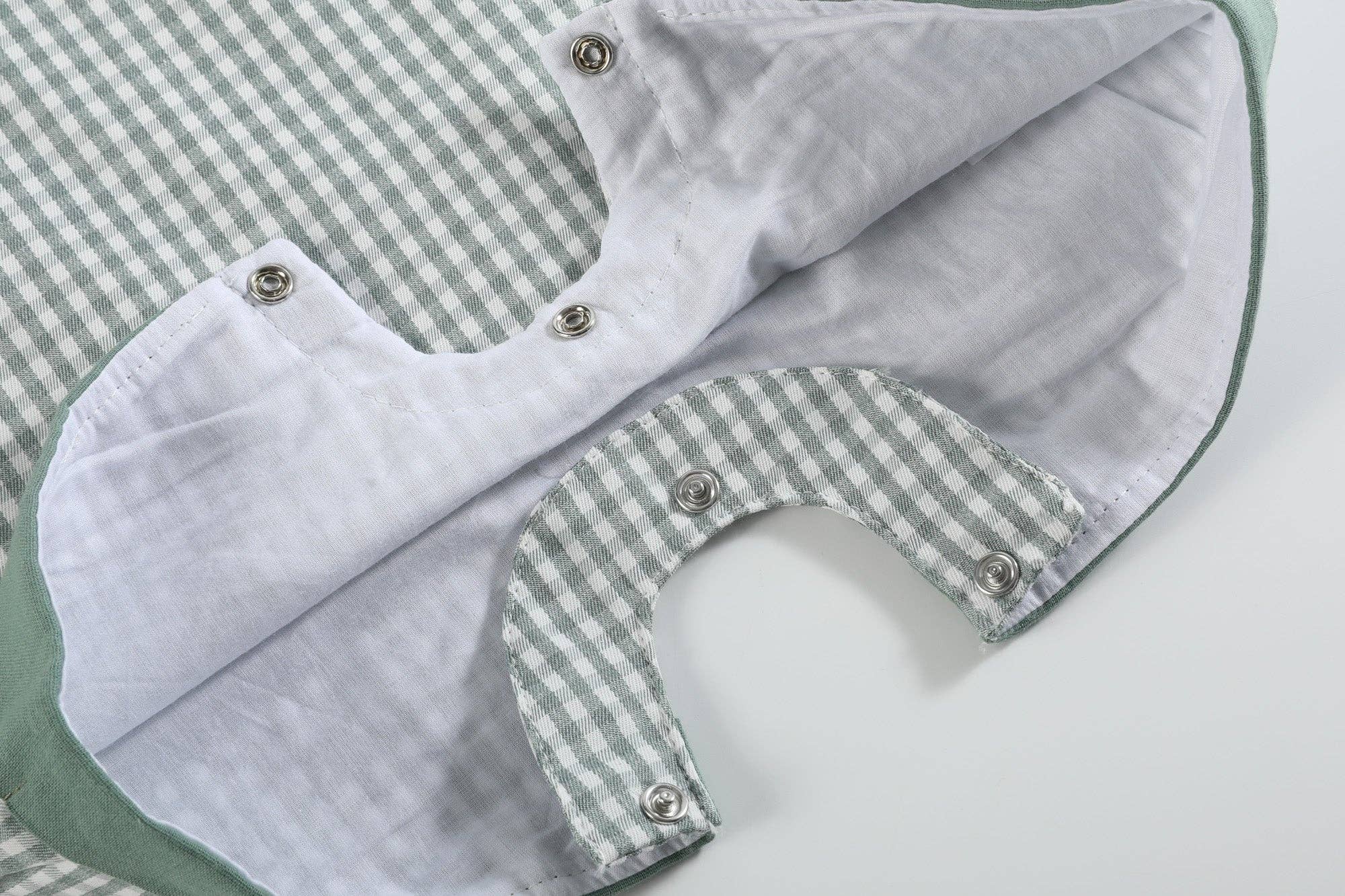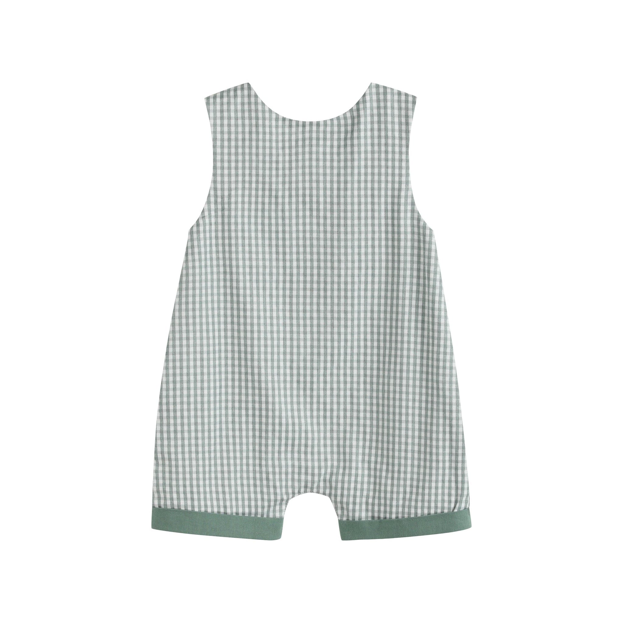 Transform your little man into a dino-mite cutie with these Green Gingham Dinosaur Smocked Shortalls! This stylish set features a classic green gingham material smocked around the chest and adorned with a playful dinosaur embroidery. Perfect for any little boy who loves to stand out!