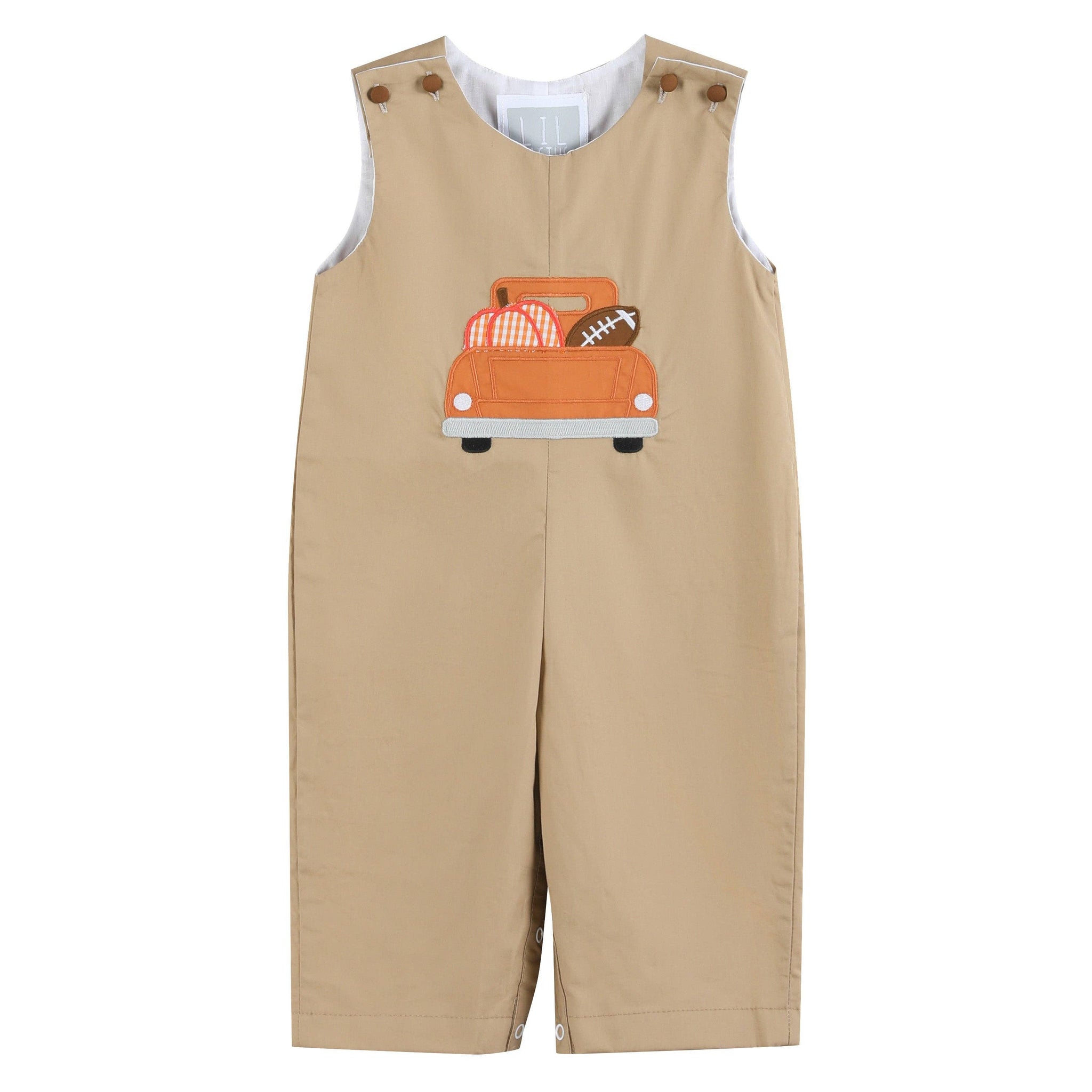 Get your little guy game-day ready with these Light Brown Pumpkin Football Truck Overalls! Featuring an adorable applique truck carrying a pumpkin and football, this outfit is perfect for football season and Thanksgiving celebrations. Coordinating buttons at the shoulders offer adjustable sizing, while crotch snaps ensure easy diaper changes. Designed for comfort and style, it’s a seasonal must-have for your little one!
